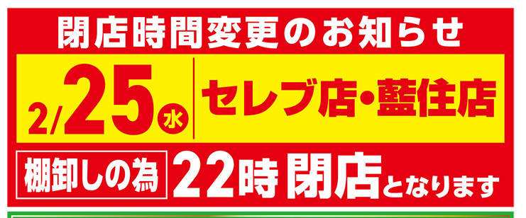 閉店時間変更のお知らせ(セレブ店・藍住店) 2026年2月19日 なかのヒトの推しごと 2026年2月25日(水)セレブ店・藍住店は店舗棚卸しの為、22時閉店とさせていただきますご不便をおかけいたしますが、ご了承くださいませ