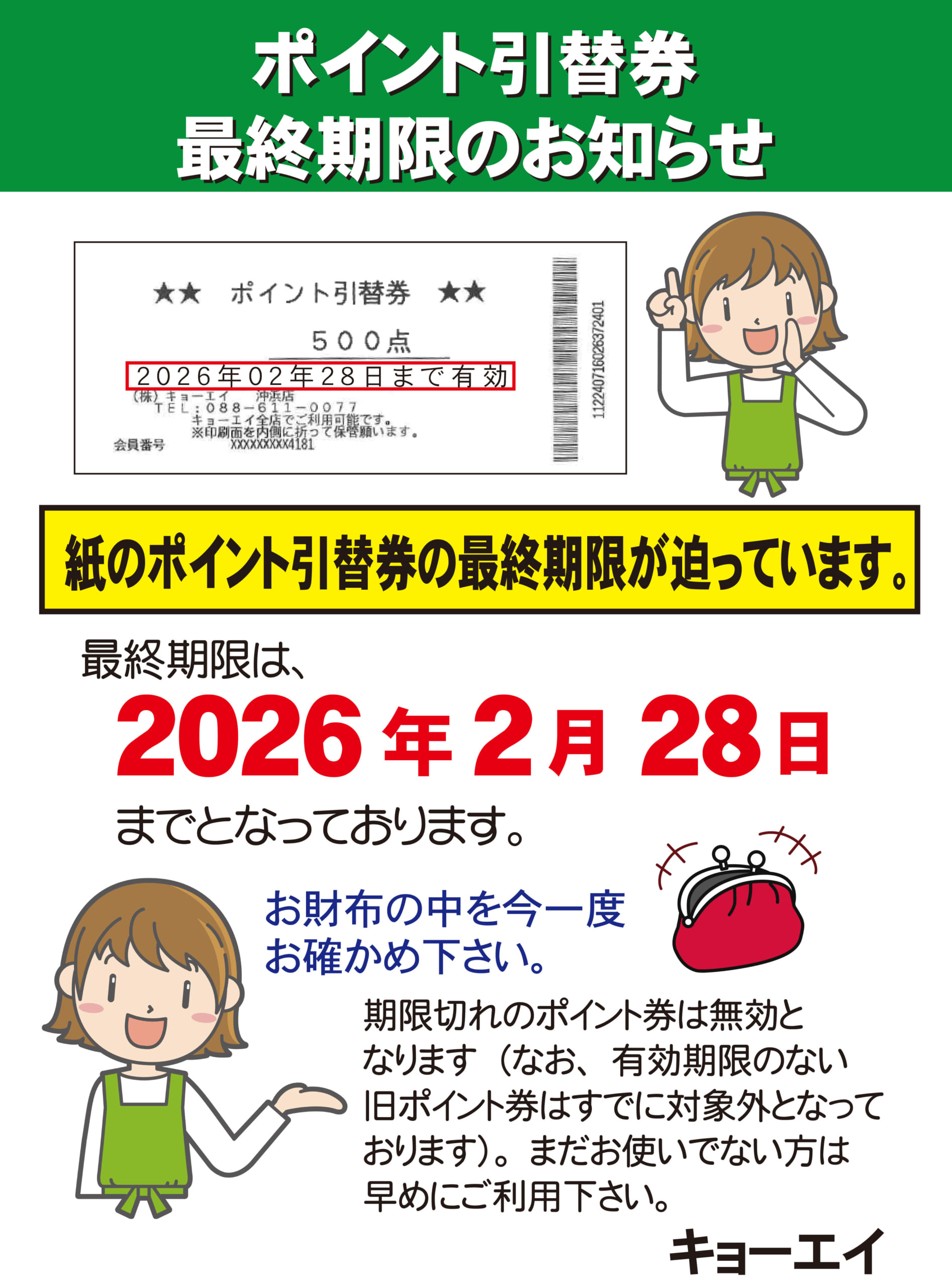 紙のポイント券の使い忘れはございませんか?お財布の中や引き出しを今一度お確かめください。有効期限が切れますと無効になります。