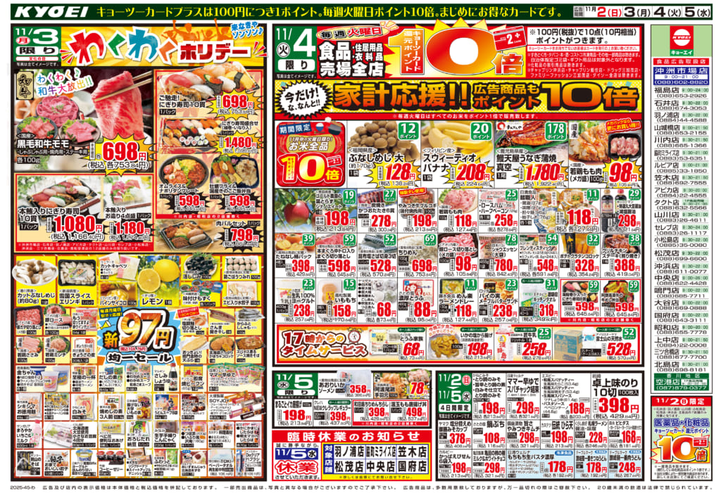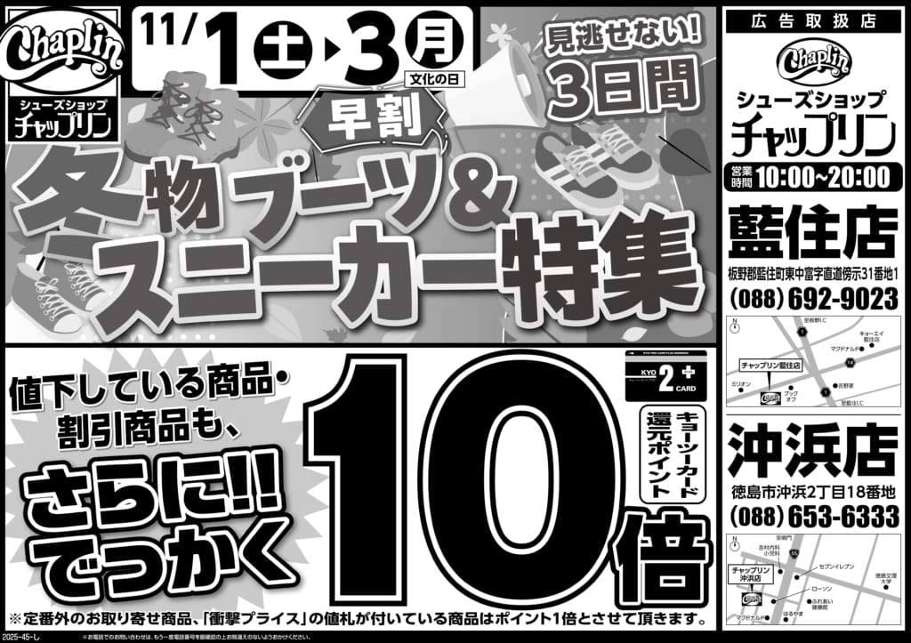 11月1日(土) 配布ちらし『チャップリン 冬物ブーツ&スニーカー特集』 冬物ブーツ&スニーカーが早割でお得! さらにキョーツーカード還元ポイント10倍!! 見逃せない3日間!!! 画像をクリックで拡大します。