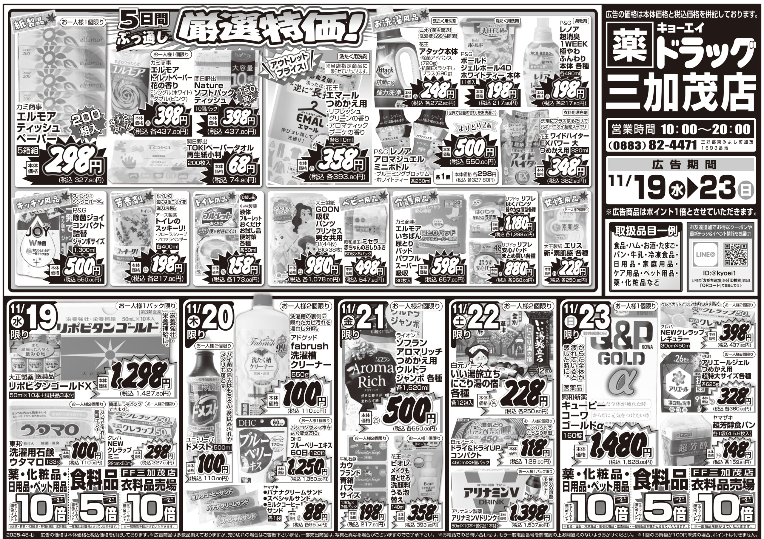 2025年11月19日(水)配布ちらし ドラッグ三加茂店『厳選特価!』