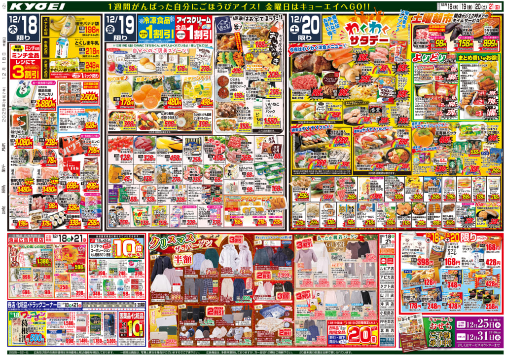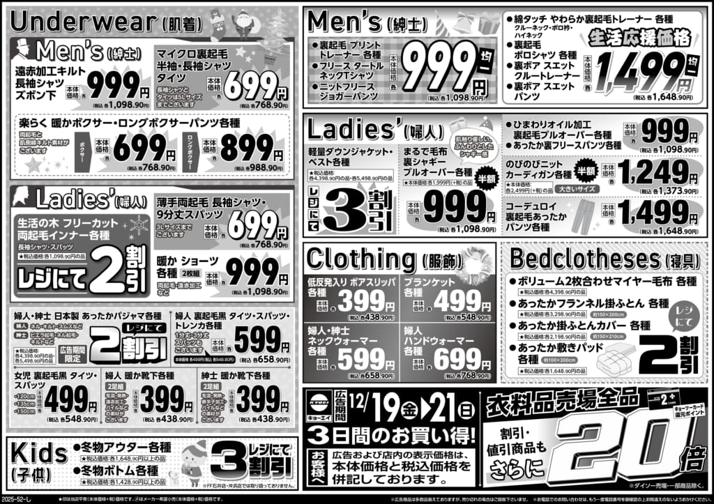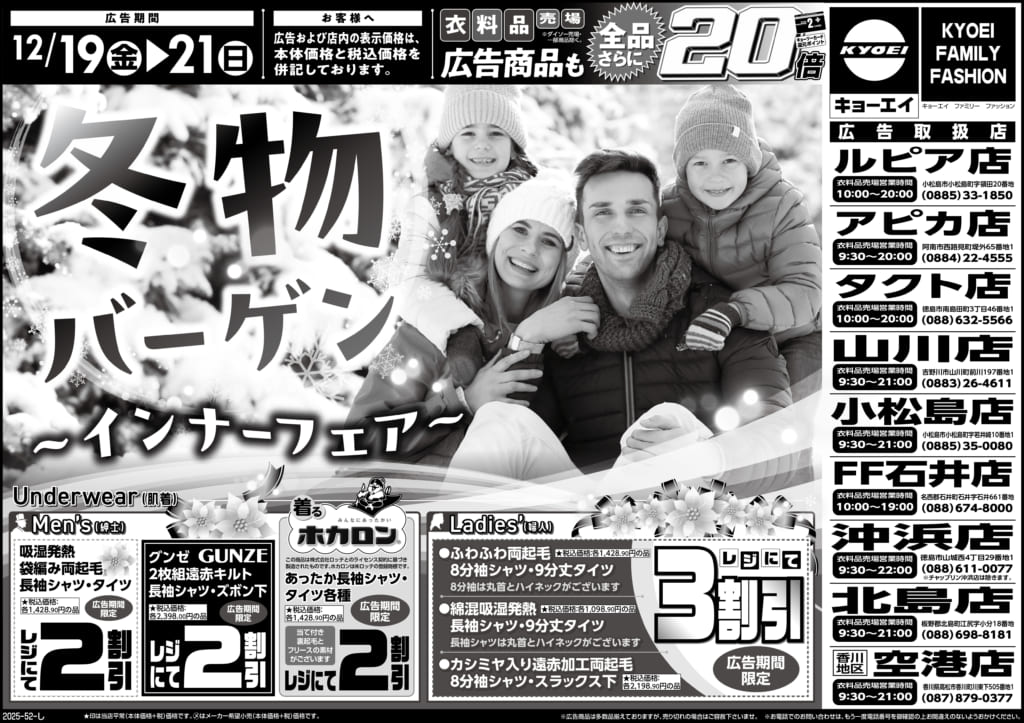 2025年12月19日(金)配布チラシ『冬物バーゲン~インナーフェア~』 今年の冬を乗り切るインナー特集! さらに、3日間は衣料品売場全品キョーツーカード還元ポイント20倍! 画像をクリックで拡大します。