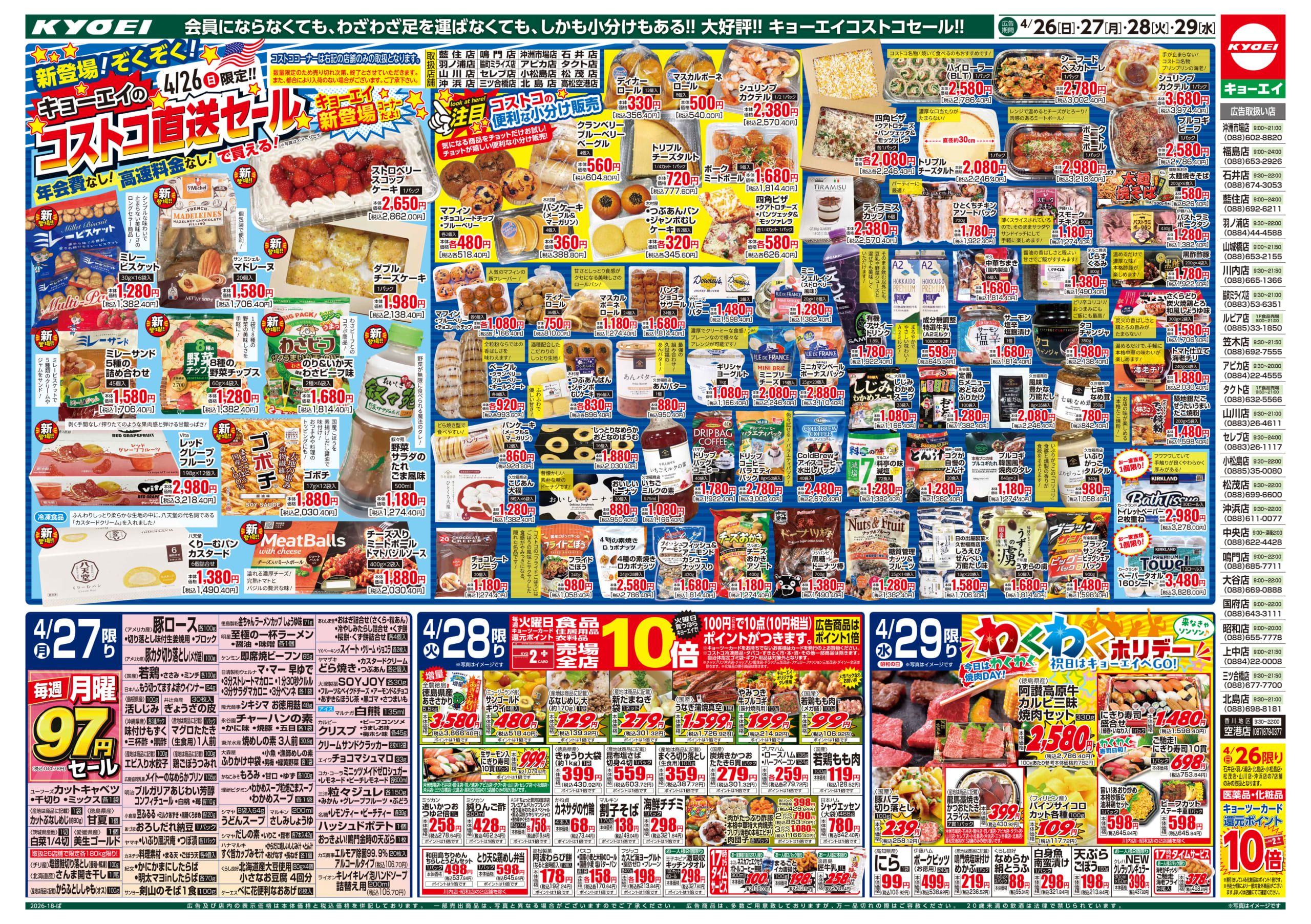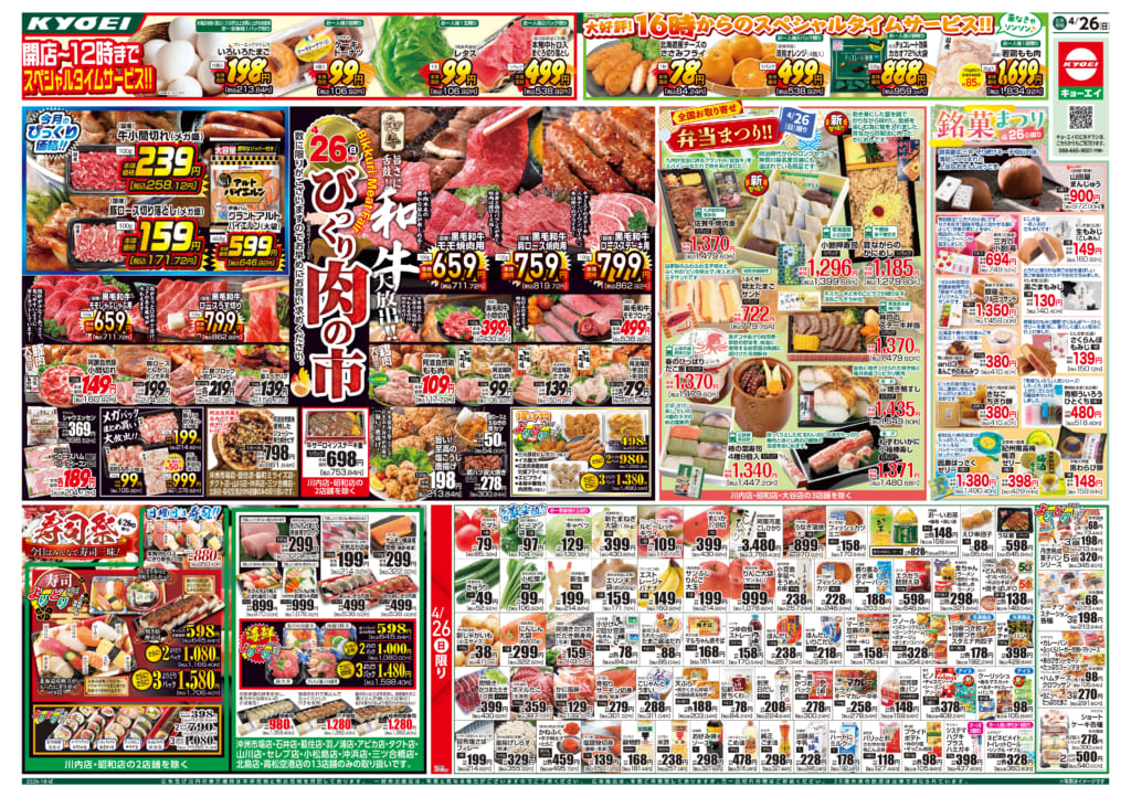 2026年4月26日(日)配布ちらし『びっくり肉の市&弁当まつり&銘菓まつり&コストコ直送セール』