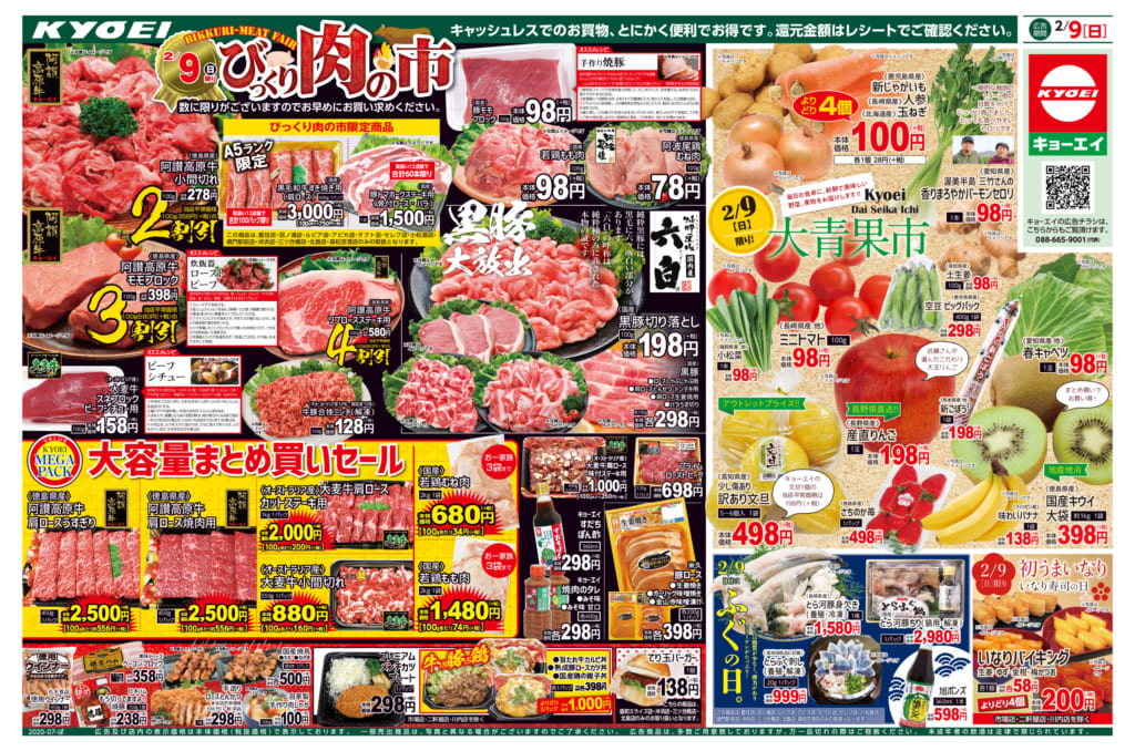 肉!肉!野菜♡ にく!ふぐ♪いなり♪ 2020年2月9日(日曜日)配布ちらし ☆2/9? にく! 肉!?『びっくり肉の市』阿讃高原牛♡ 2割引、3割引、4割引も!?本物の証! 六白黒豚♡牛 vs 豚 vs 鶏 丼対決!?肉の市限定は?? A5和牛♡ & 豚トマホーク!2月9日・・・2/9? にく! びっくり肉の市(^^♪ ☆肉!肉!野菜♡『大青果市』野菜♡ 野菜♡ 肉!?肉と一緒に♪ 大青果市m(_ _)m 追伸:2月9日・・・肉♡ だけじゃない!?『ふぐの日』&『いなり寿司の日』m(_ _)mm(_ _)m