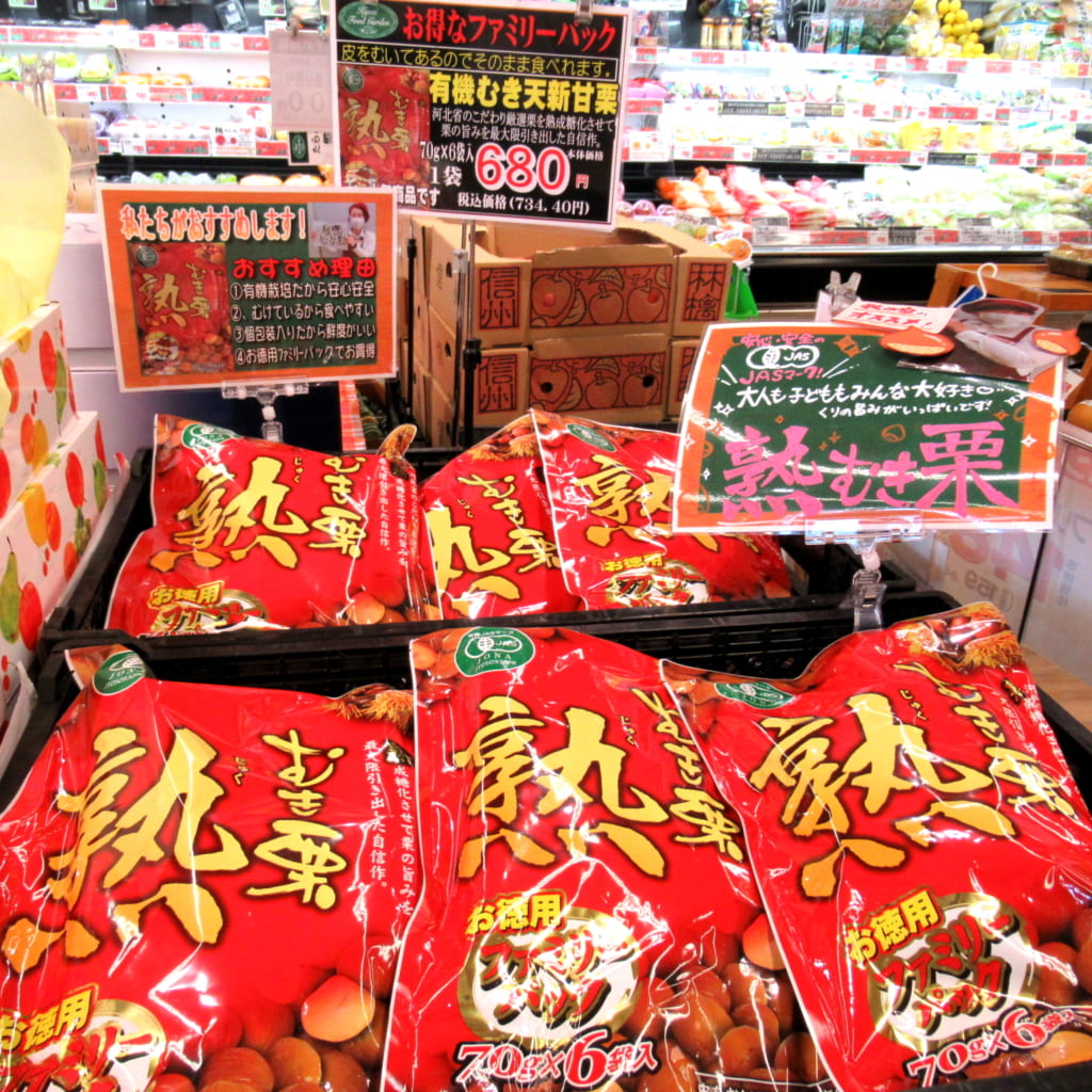 秋の推ススメ『むき栗 熟(じゅく)』 【食欲の秋、熟成の秋】キョーエイ三ツ合橋店より 安全・安心の有機JASマーク入り!皮は剥いてますので、食べやすい!個包装で、ひと粒ひと粒、鮮度抜群!お徳用ファミリーパックでお買得! 有機天津甘栗『むき栗 熟(じゅく)』 河北省のこだわりの厳選栗を”熟”成糖化させて栗の旨みを最大限引き出した自信作! 食欲の秋、熟成の秋熟くりの秋が、とまりません(^^♪