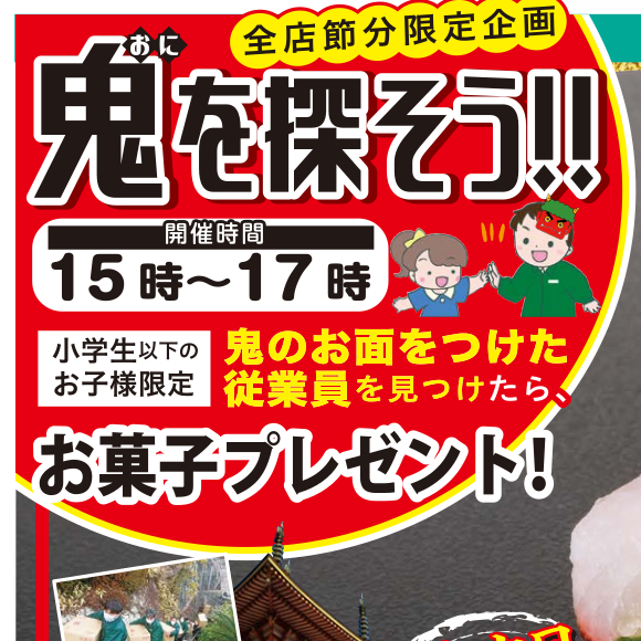 全店節分限定企画 『鬼を探そう!!』 【鬼を探そう!!】2/3(木)配布ちらしより キョーエイの恵方は笑う方楽しくなければ節分じゃないと・いうことで! 2月3日(木曜日)全店節分限定企画『鬼を探そう!!』”15時〜17時”にて開催”小学生以下のお子様”限定です 節分コーディネートは、こうでねえと”鬼のお面”をつけた従業員”鬼にいさん、鬼ねえさん”見つけて”お菓子”・・・ゲットだぜっ!
